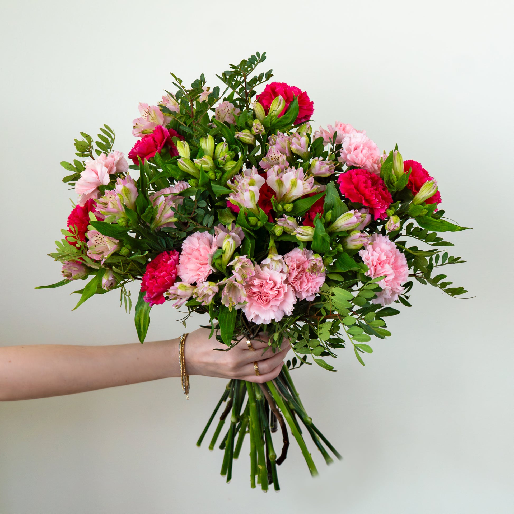 Show your affection with a sweet and fluffy pink bouquet of fuchsia and pink Carnations, and lovely pink Alstroemeria with lush greenery.