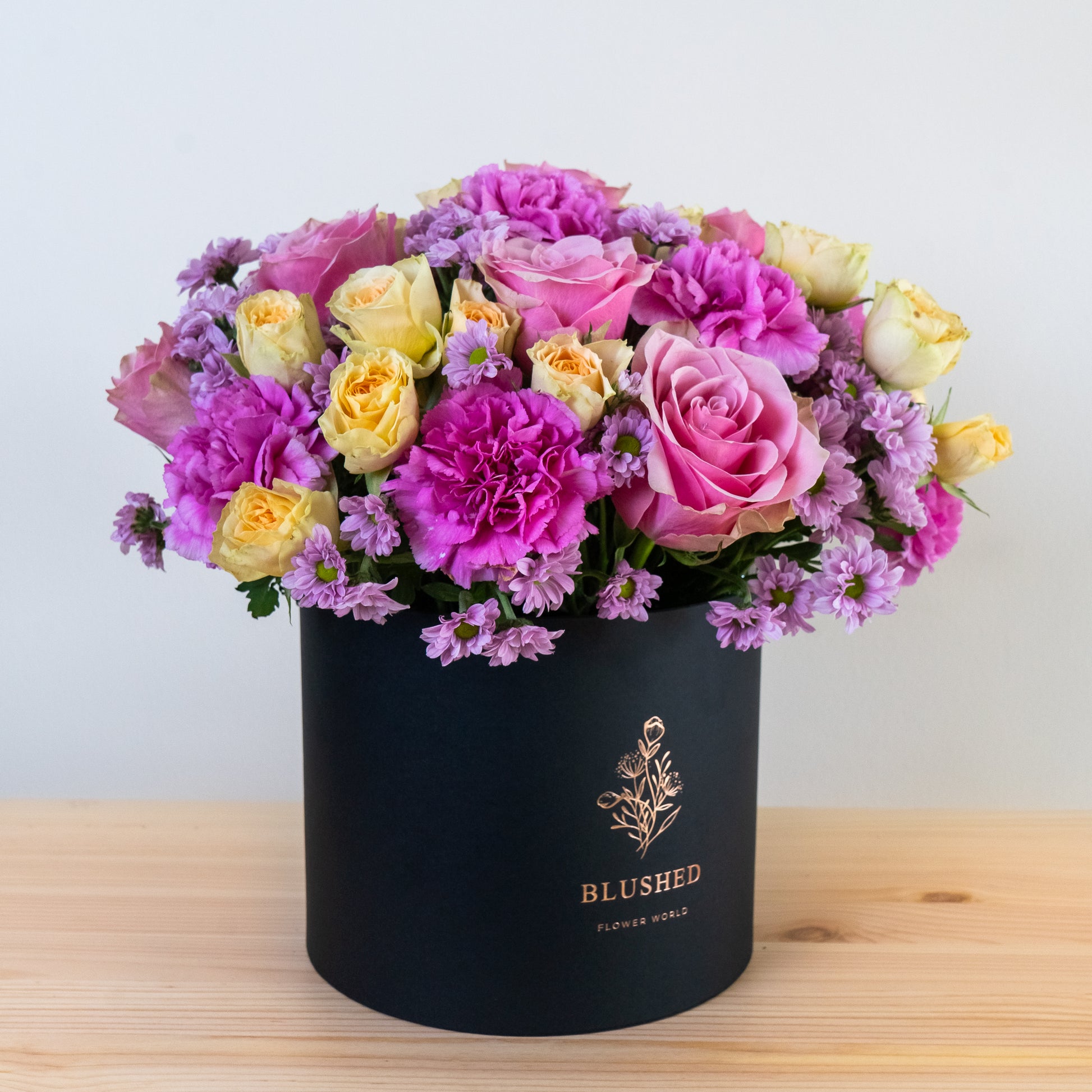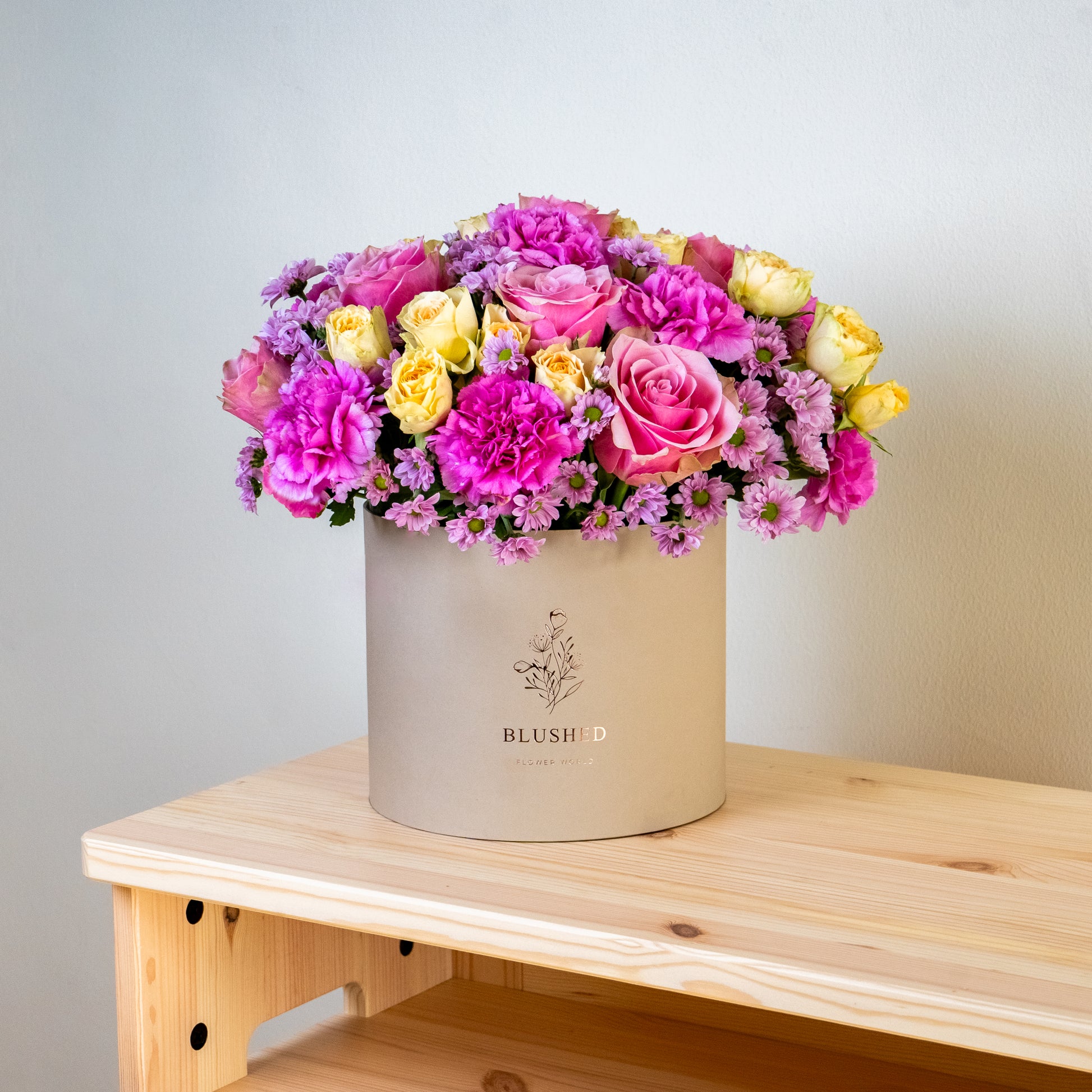 Your arrangement will come in our signature Blushed Cylinder Box, as pictured, along with a complimentary sachet of flower food and a standard Blushed notecard.