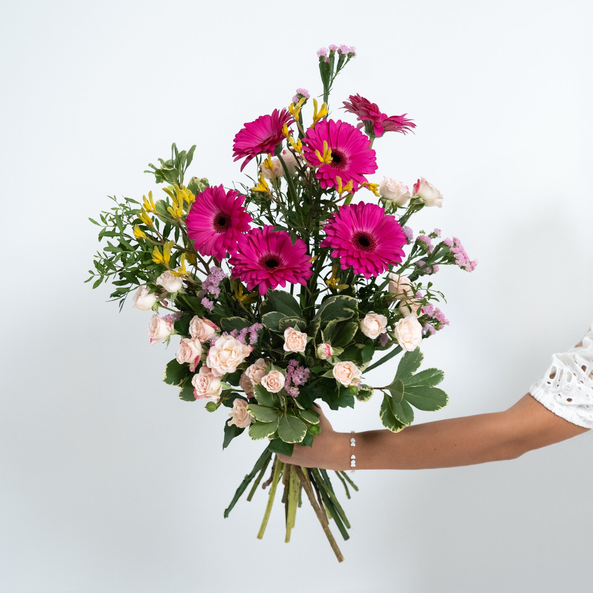Invigorating with a pop of color, our Hot Pink! bouquet is centered around bright and beautiful rich pink Gerberas and complimented by light pink Spray Roses, Kangaroo Paws, light pink Statice, with Pistacia and Pittosporum for greenery.