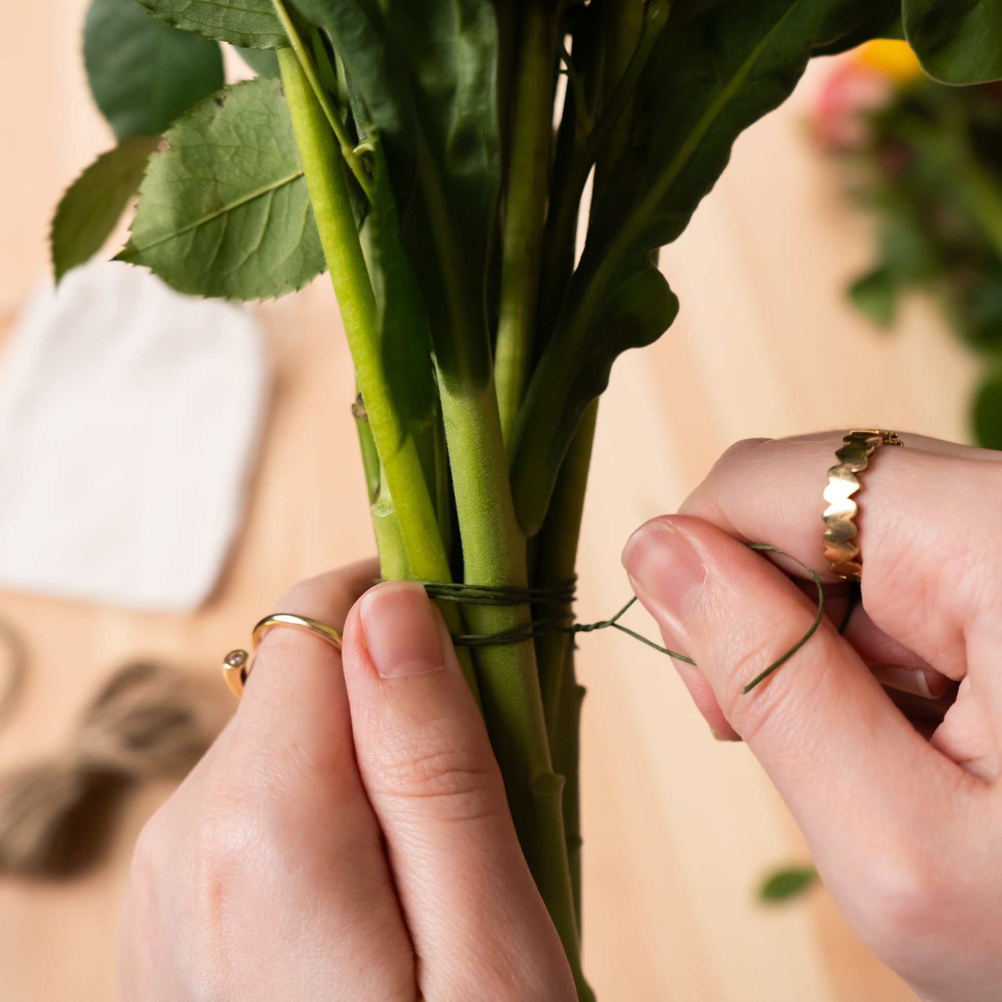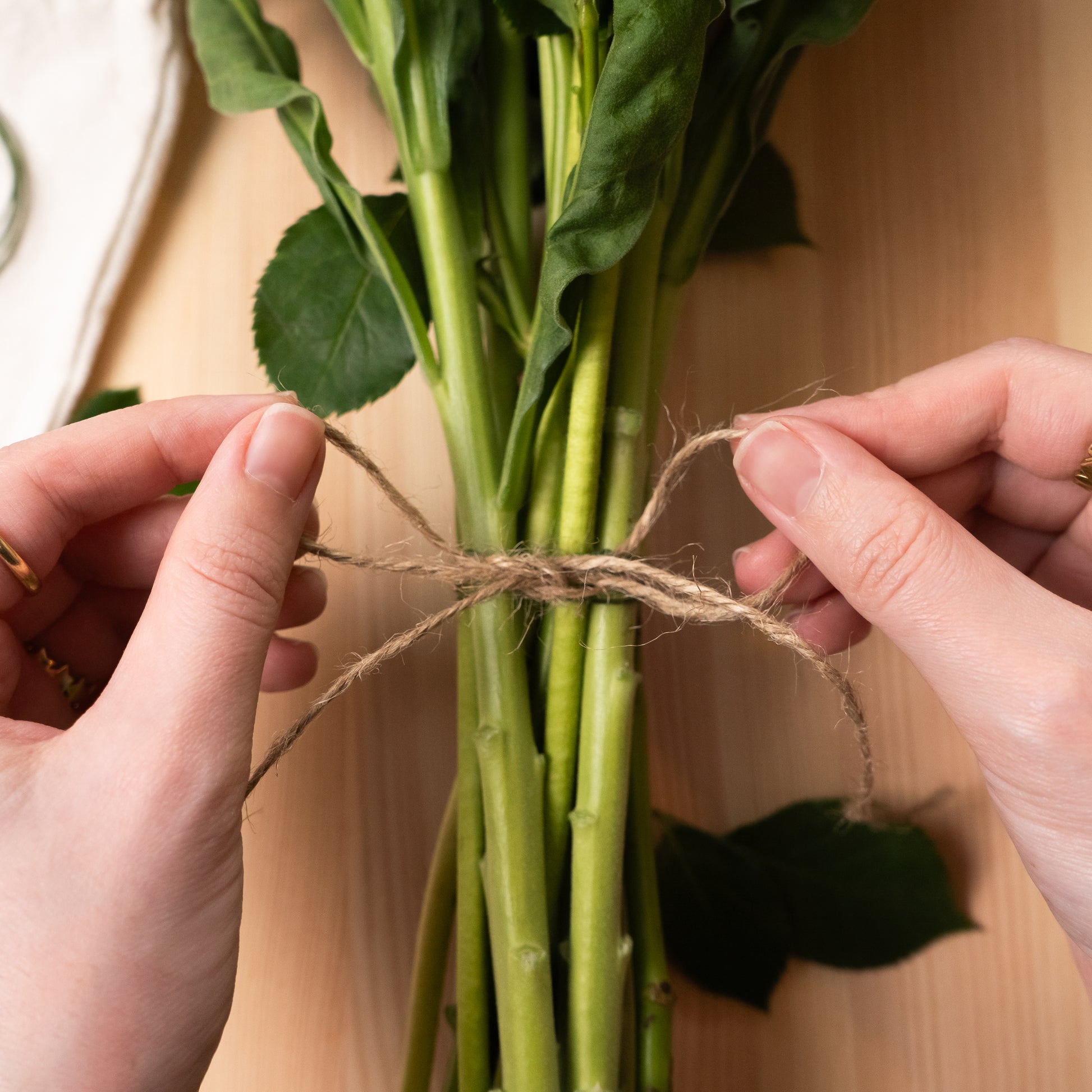 Tip: You can use the green wires to seamlessly hold together your blooms by tightly wrapping them around your stems, carefully twisting the two ends together once they meet to secure them, before going in with the jute rope to add a rustic feel.