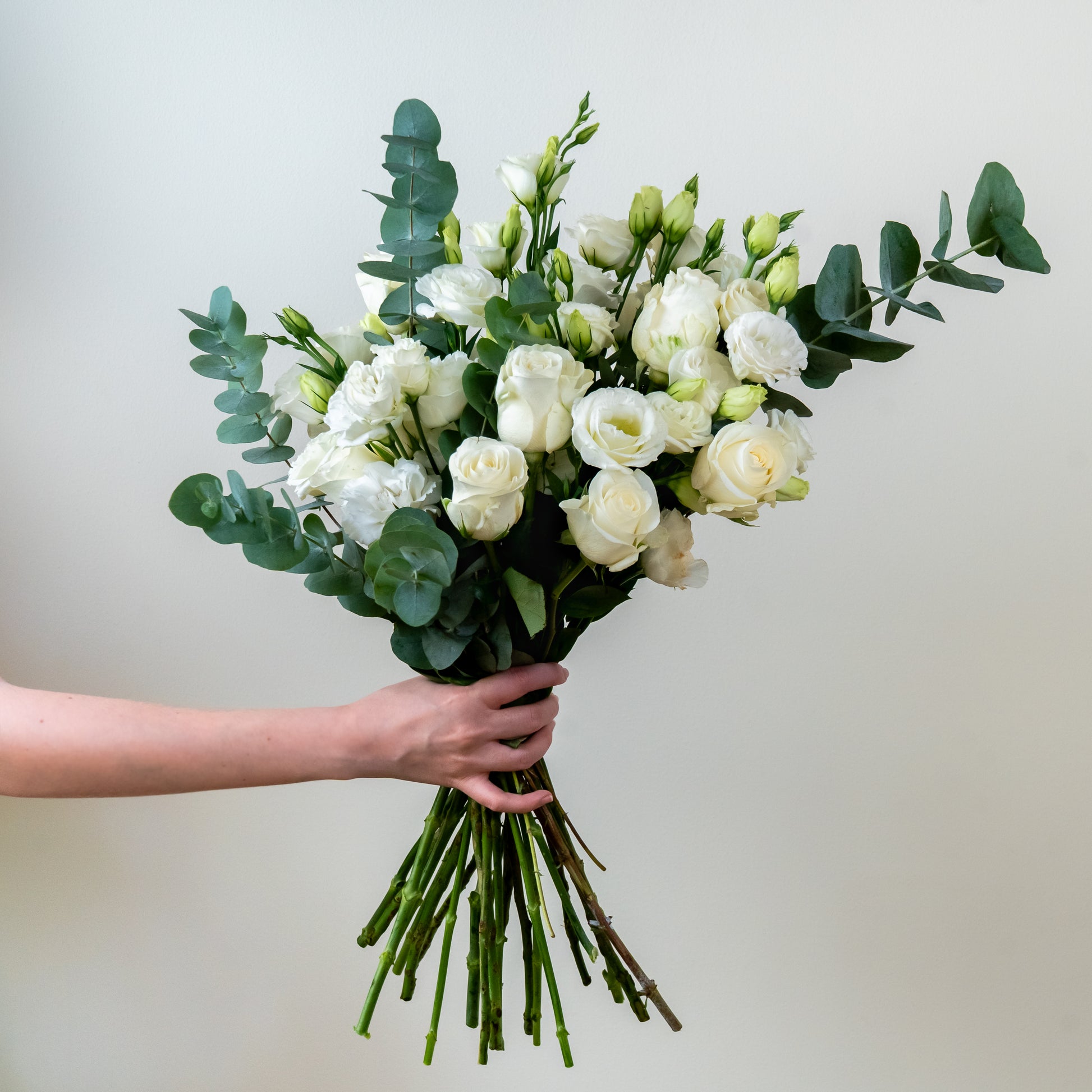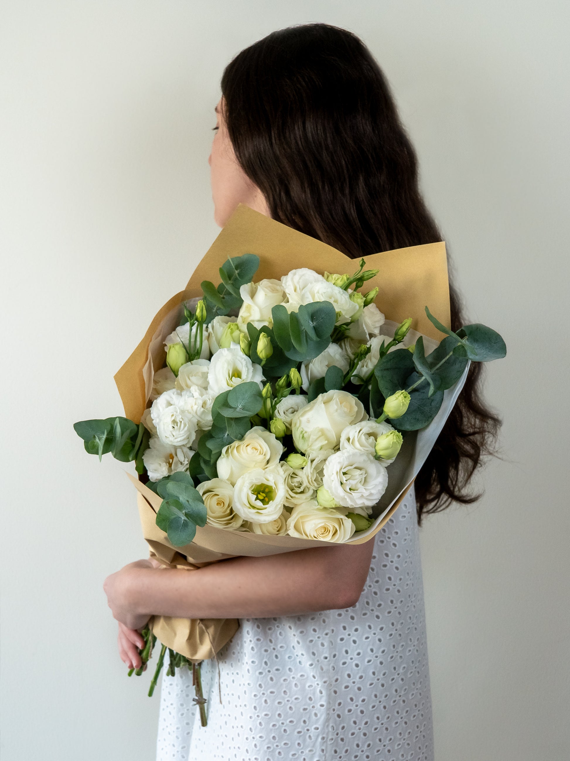Classic and elegant, our Pure bouquet features white roses and lisianthus along with fragrant eucalyptus.