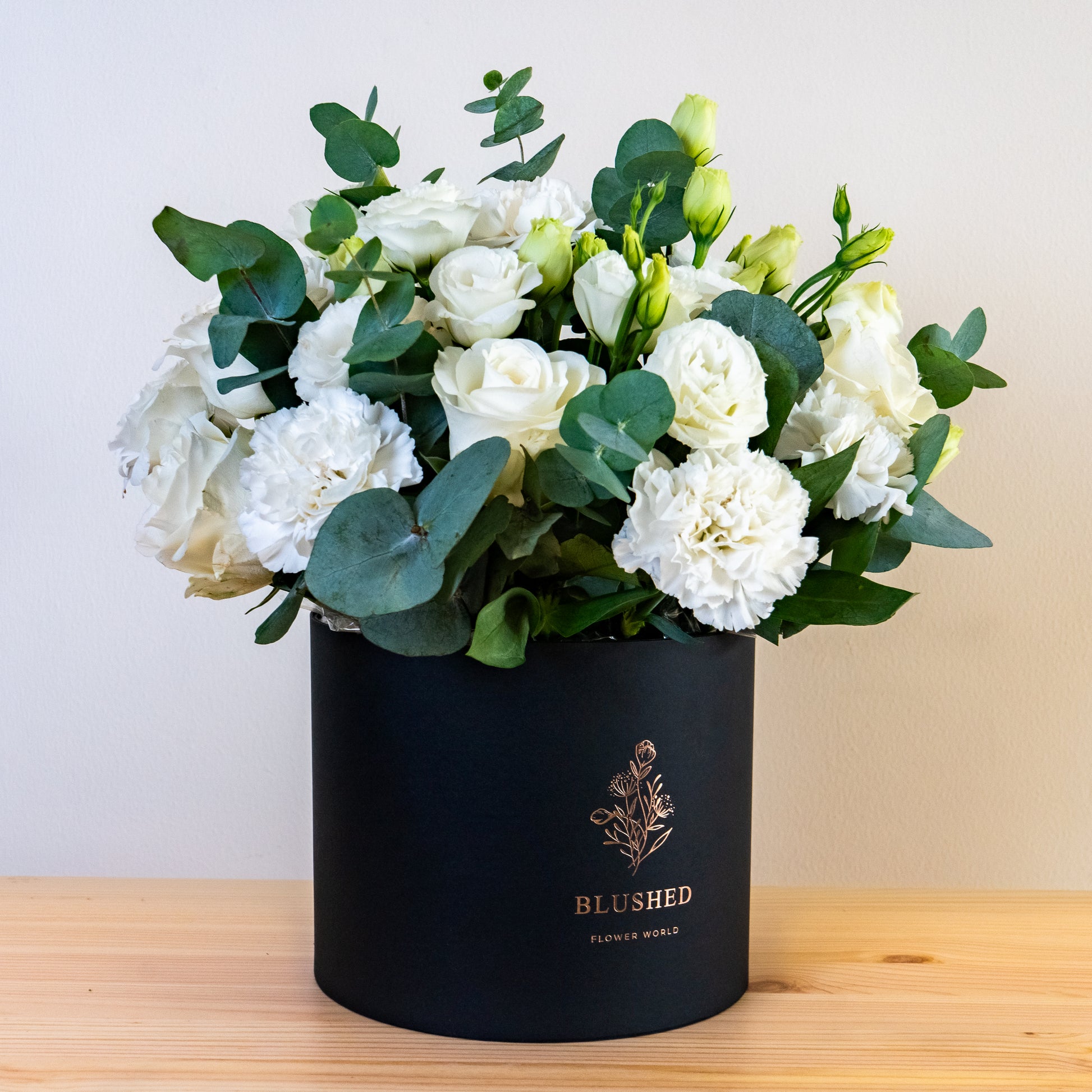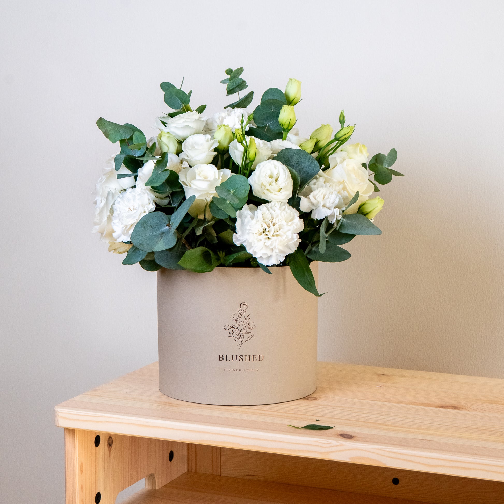 The perfect gift for tender moments - a pure and elegant mix of white Carnations, Roses, and Lisianthus, complimented by fragrant Eucalyptus.